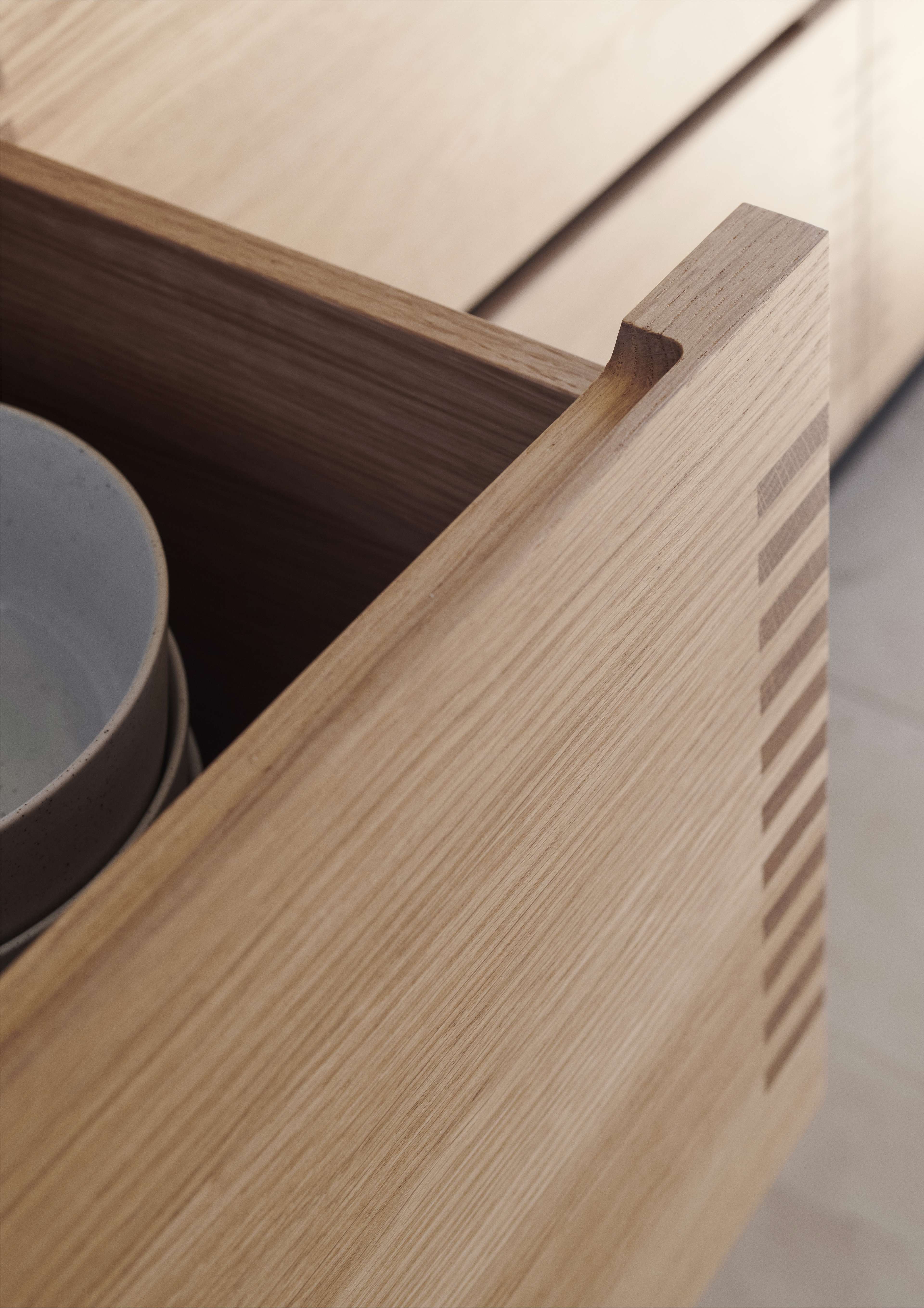 Oakwood er selve symbolet på smart dansk design. Vi har tenkt funksjonell design og laget en stil med 3 skuffer, atskilt med tynne svarte linjer uten mellomrom, slik at det blir lettere å holde rent. Og stilen med 3 skuffer på skuffer og fronter gjør at den harmoniske designen skinner gjennom.