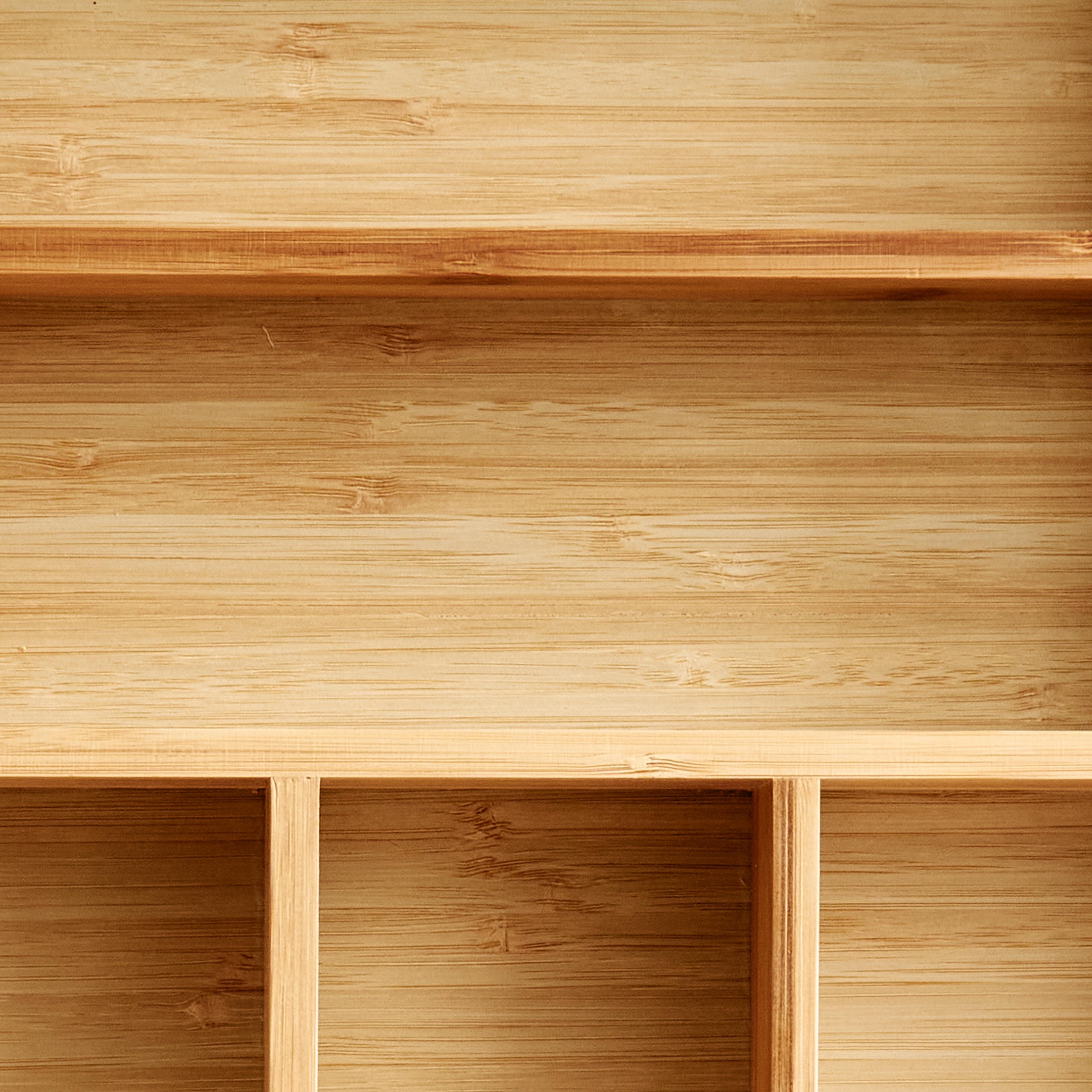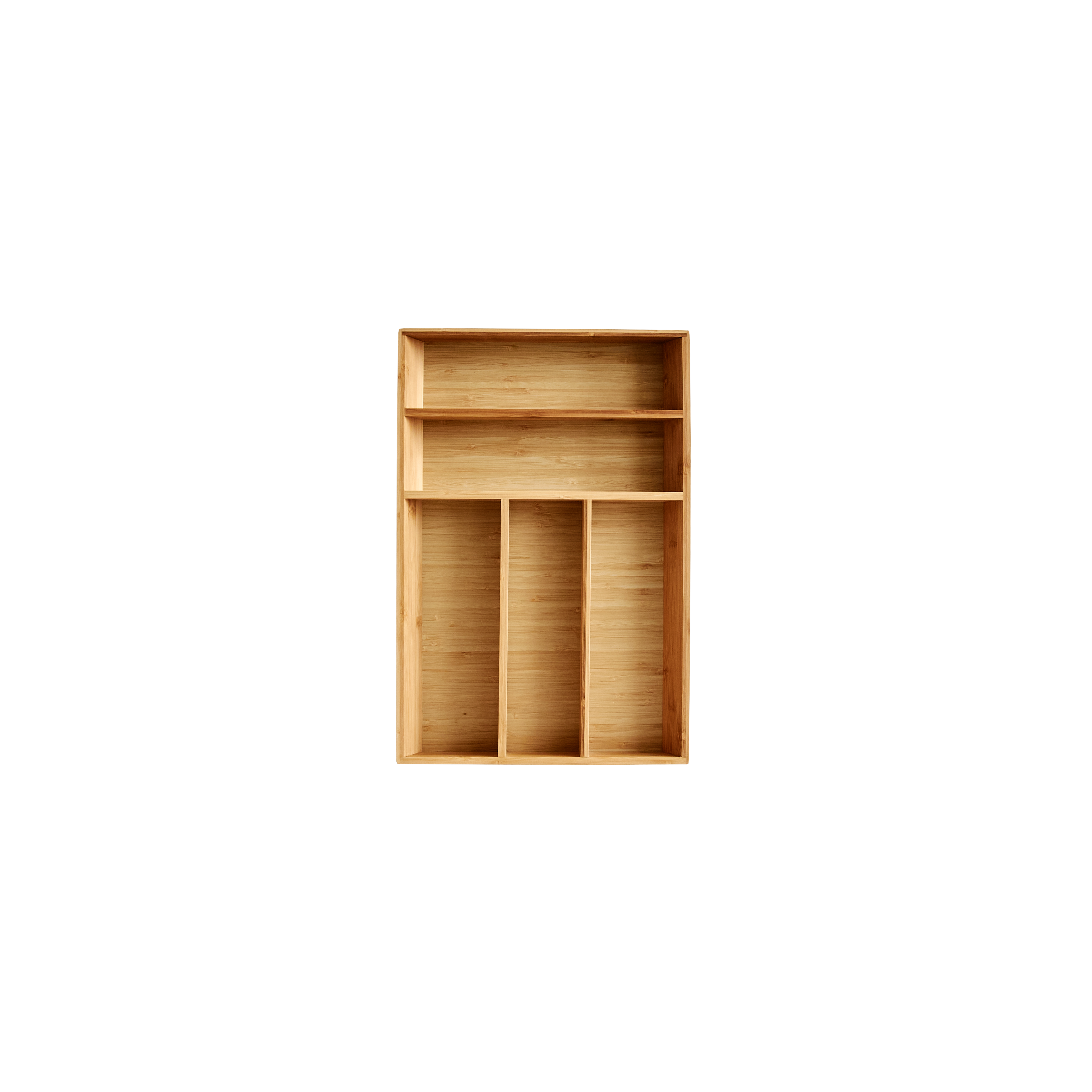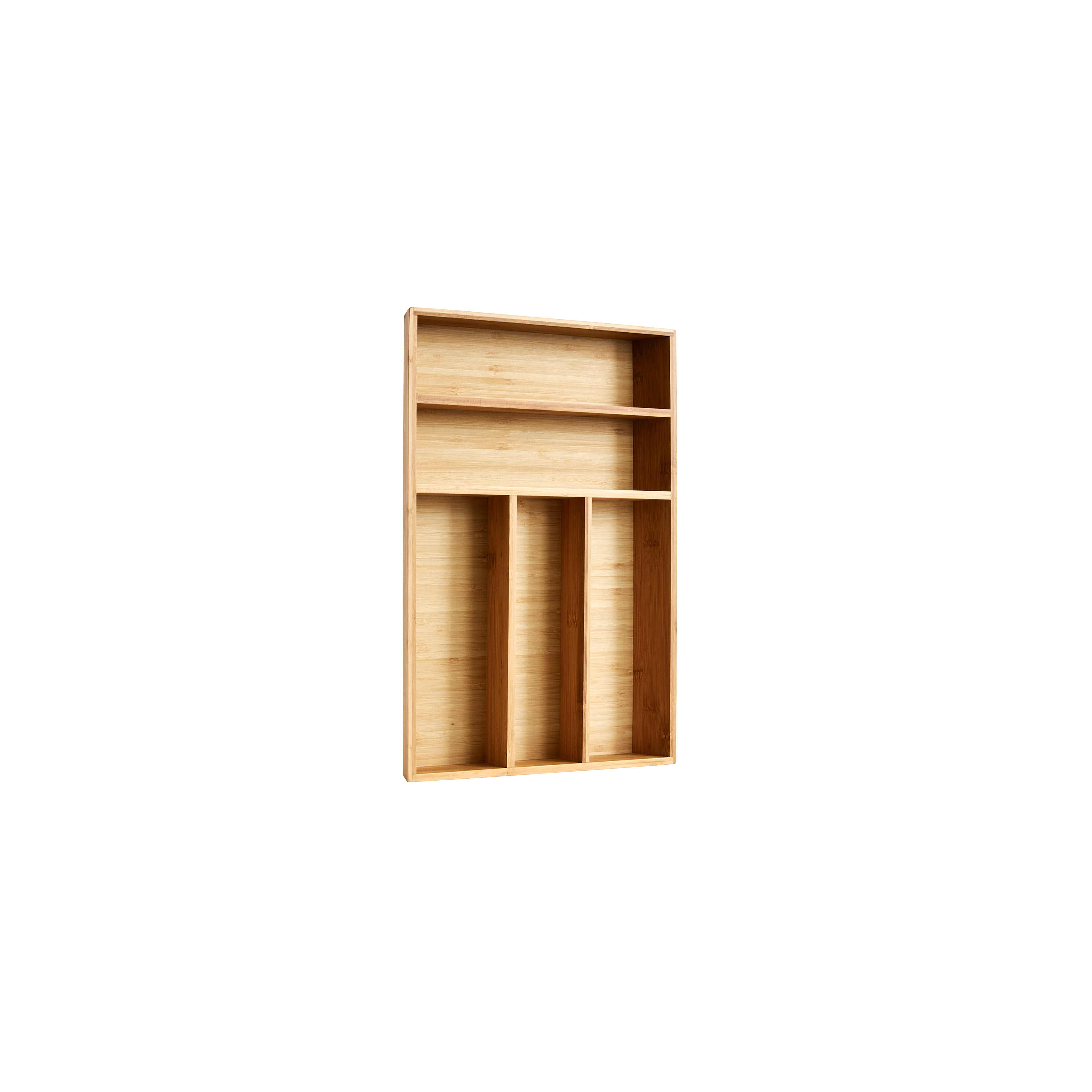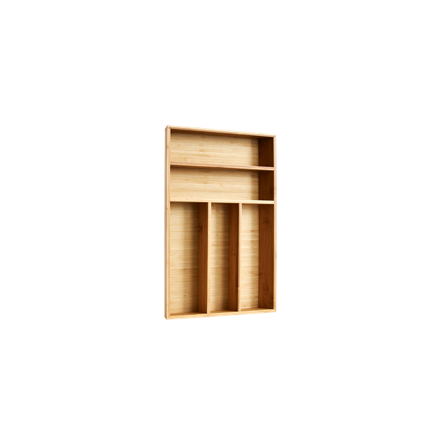 Vårt bestikkinnlegg i bambus skiller seg ut med sin kombinasjon av naturlig skjønnhet og praktisk design. Med en bredde på 40 cm er det ideelt for å passe i ulike skuffestørrelser, noe som gjør det til en fleksibel løsning for ethvert kjøkken. De mange rommene gir deg muligheten til å organisere bestikk og redskaper på en oversiktlig måte, slik at du alltid har det du trenger lett tilgjengelig.