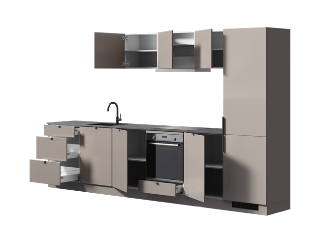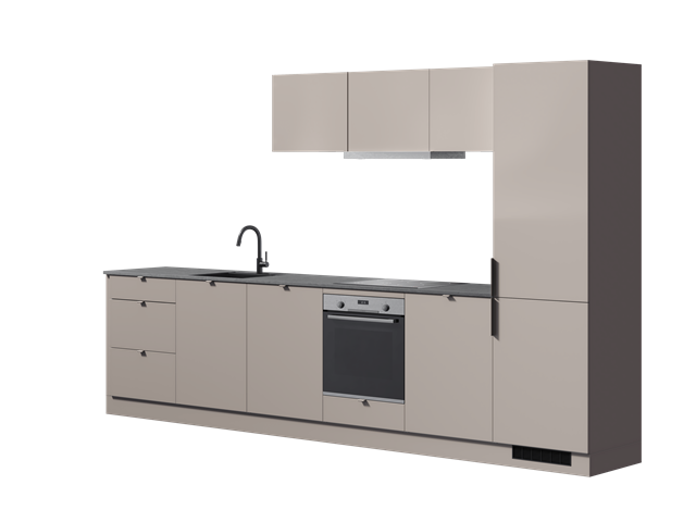 Vårt Bordo arizona beige kjøkkensett gir en stilfull og praktisk løsning for ditt kjøkken. Den mørkegrå benkeplaten gir en flott kontrast til de arizona beige skapene, og skaper en moderne atmosfære. Med en overflate som er motstandsdyktig mot fingeravtrykk, er det enkelt å holde kjøkkenet rent og pent. Våre håndtakskolleksjoner gir deg muligheten til å tilpasse kjøkkenet etter din smak, enten du foretrekker en klassisk, moderne, industriell eller minimalistisk stil.