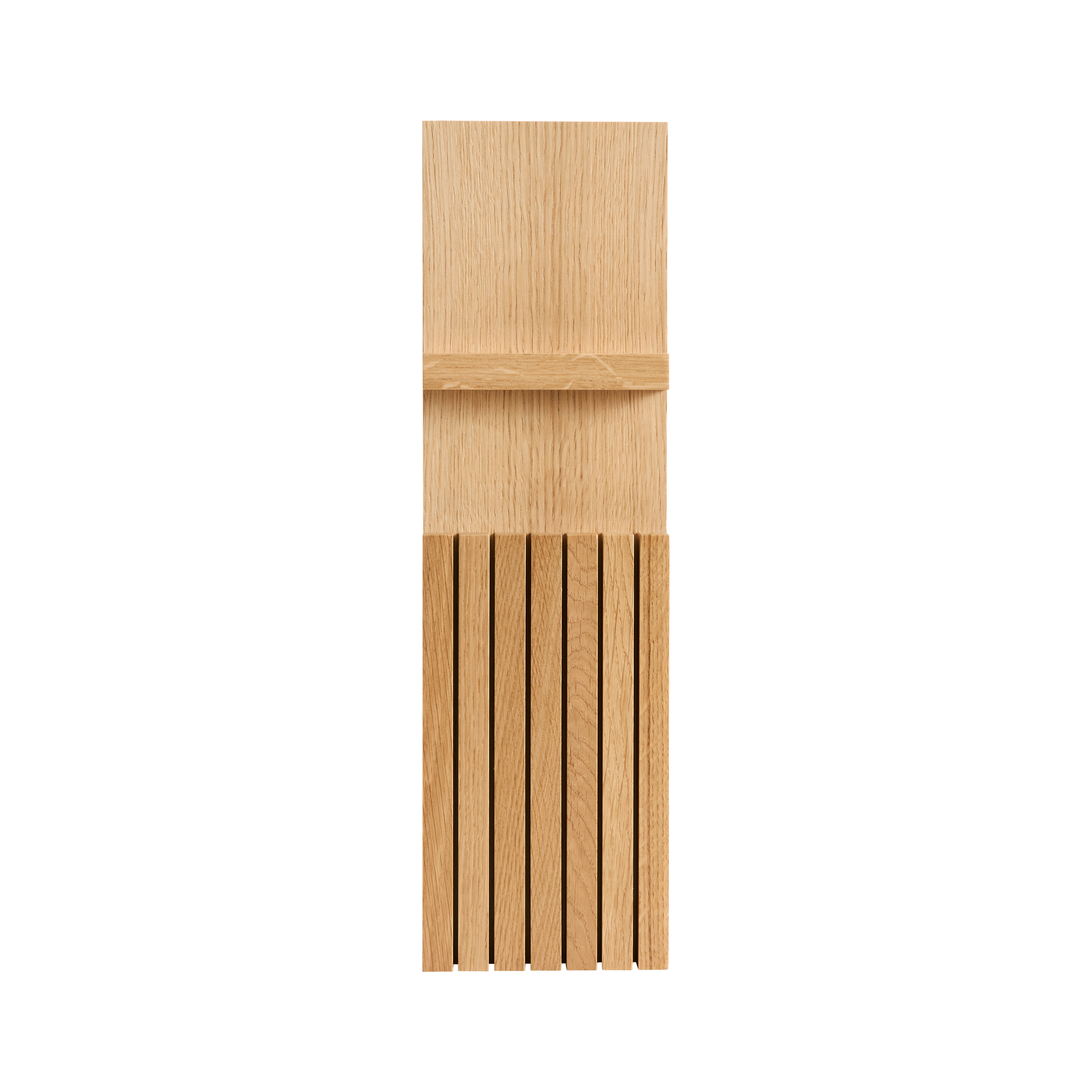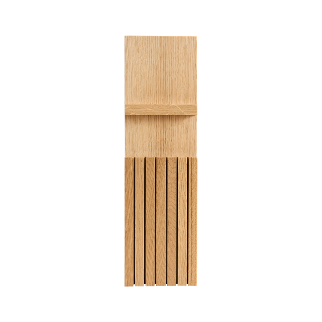 Oppdag vår knivholder i eik, en elegant løsning for å holde kjøkkenknivene dine lett tilgjengelige og trygt oppbevart. Denne stilige modellen passer perfekt i kjøkkenskuffen og gir både praktisk oppbevaring og et sofistikert preg til kjøkkenet ditt. Med plass til seks kniver og en design som passer de fleste skuffer, er den både funksjonell og estetisk tiltalende.