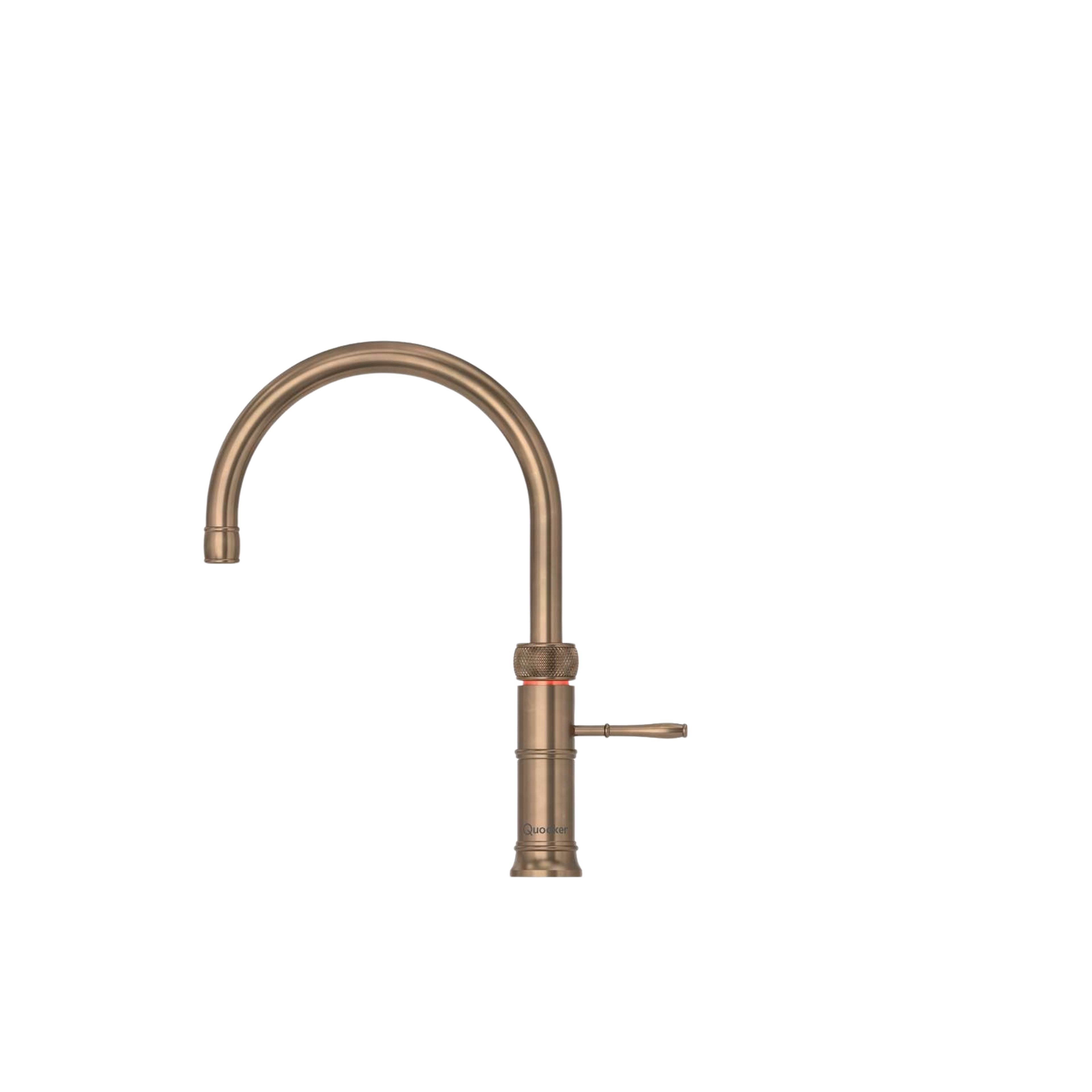 Vi introduserer Quooker Classic Fusion Round-kranen fra Kvik, en perfekt blanding av tidløs eleganse og moderne bekvemmelighet. Kranen er laget i patinert messing og tilfører ethvert kjøkken et streif av raffinement. Med en høyde på 366 mm gir den god plass til å fylle gryter og vaske opp. Kranens innovative design kombinerer varmt, kaldt og kokende vann i ett, noe som gjør den til et uunnværlig verktøy for hverdagslige kjøkkenoppgaver. Nyt luksusen av øyeblikkelig kokende vann rett ved fingertuppene.