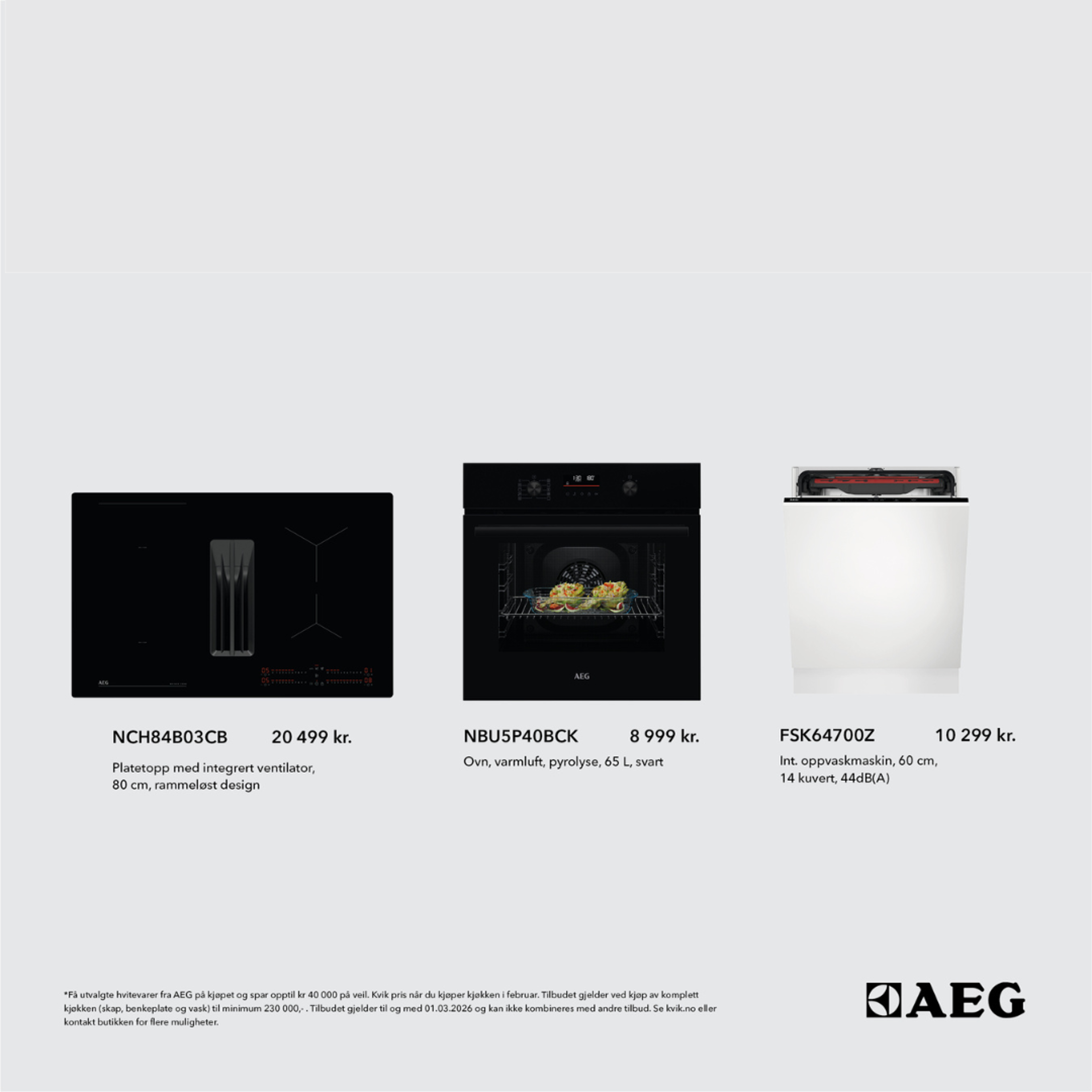 *Få utvalgte hvitevarer fra AEG og Electrolux for opptil kr 40 000 på kjøpet når du kjøper kjøkken i februar. Tilbudet gjelder ved kjøp av komplett kjøkken (skap, benkeplate og vask) til kr 230 000,- . Tilbudet gjelder til og med 03.03.2026 og kan ikke kombineres med andre tilbud. Se kvik.no for ulike nivåer på rabatt.